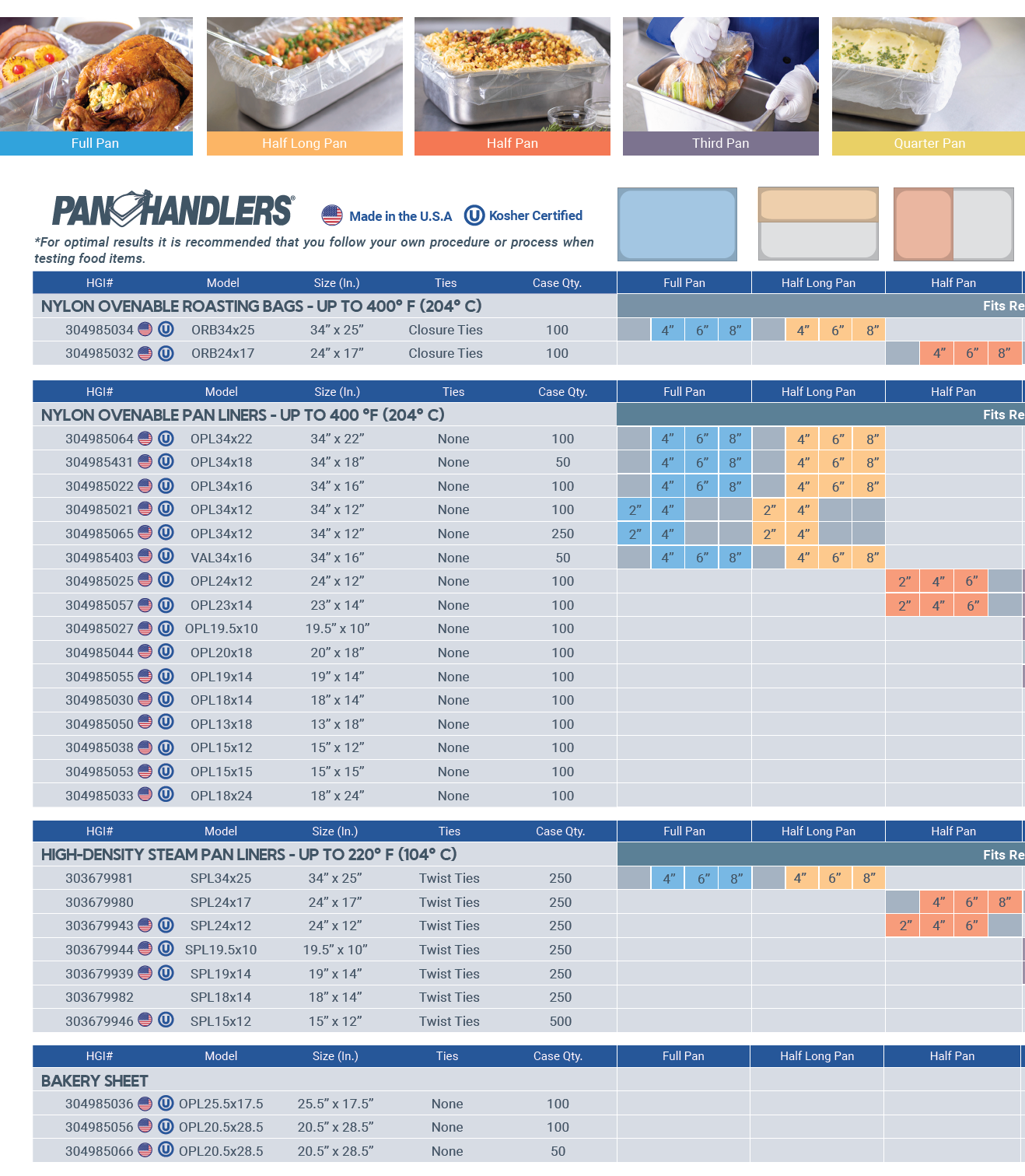 Ovenable pan liners are made of nylon material that can withstand temperatures of up to 400° F (204° C). These liners are ideal for baking and cooking and come in a variety of sizes. These liners are Made in the U.S.A.
